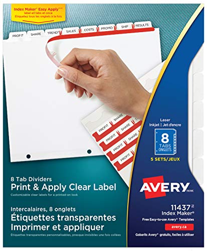 Avery® Print & Apply Clear Label Dividers, Index Maker® Easy Apply™ Printable Label Strip, 5 White Tabs (11416)